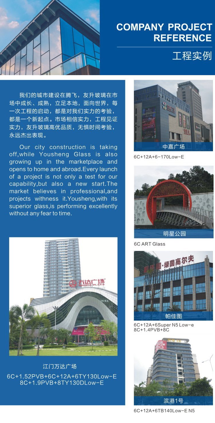 公司以研发销售各种安全玻璃深加工为主,(平钢化、弯钢化、均质、中空、夹层、彩釉、镀膜、低辐射Low-E、防火)同时,得益于社会各界的信赖及业务高速发展,我司与时俱进同时提供电控调光玻璃、中空内置百页玻璃、真空玻璃、纳米膜玻璃、数码打印玻璃、艺术夹层玻璃等产品,