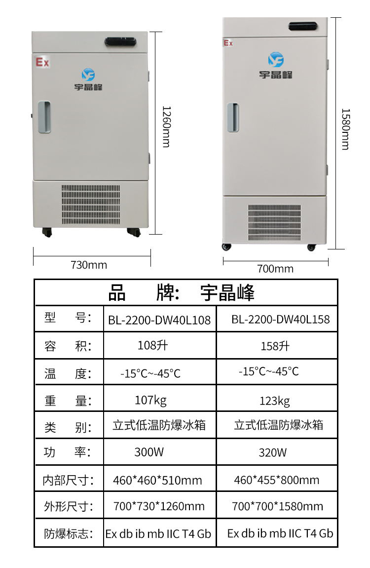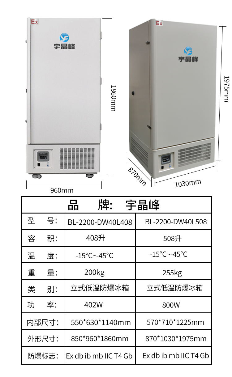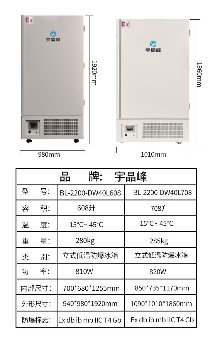 宇晶峰-65度化工厂医院药房立式超低温防爆冰箱