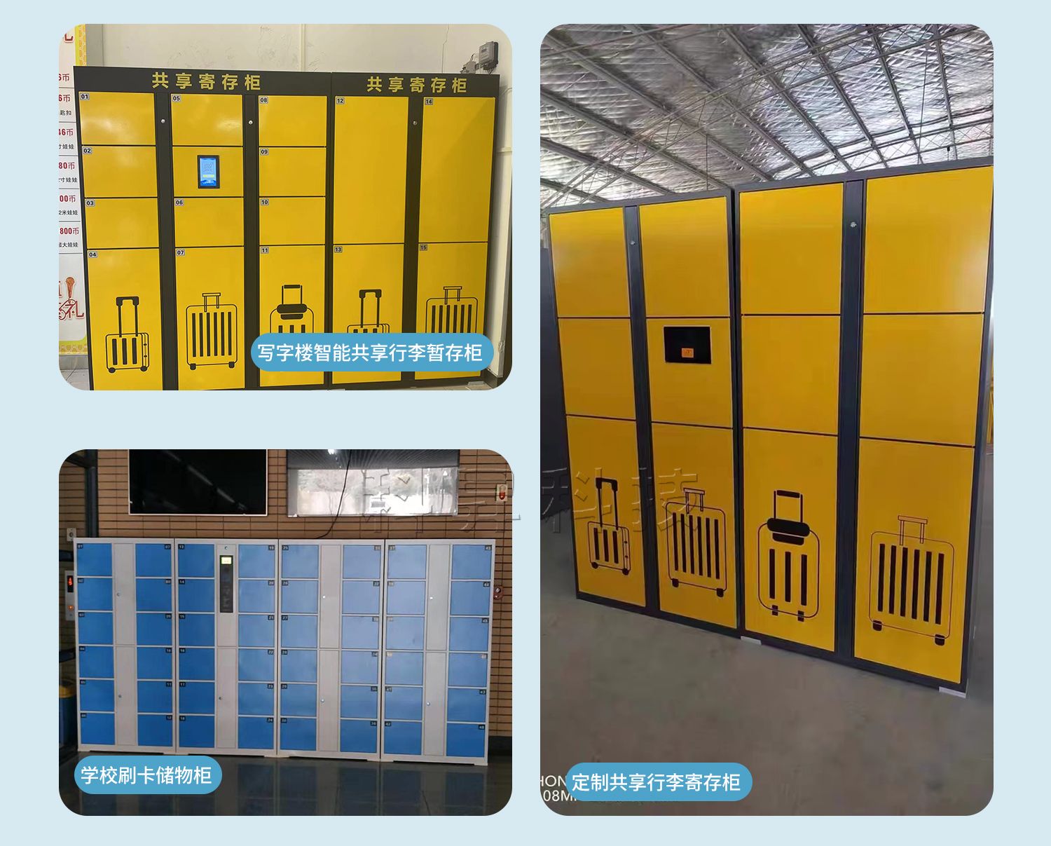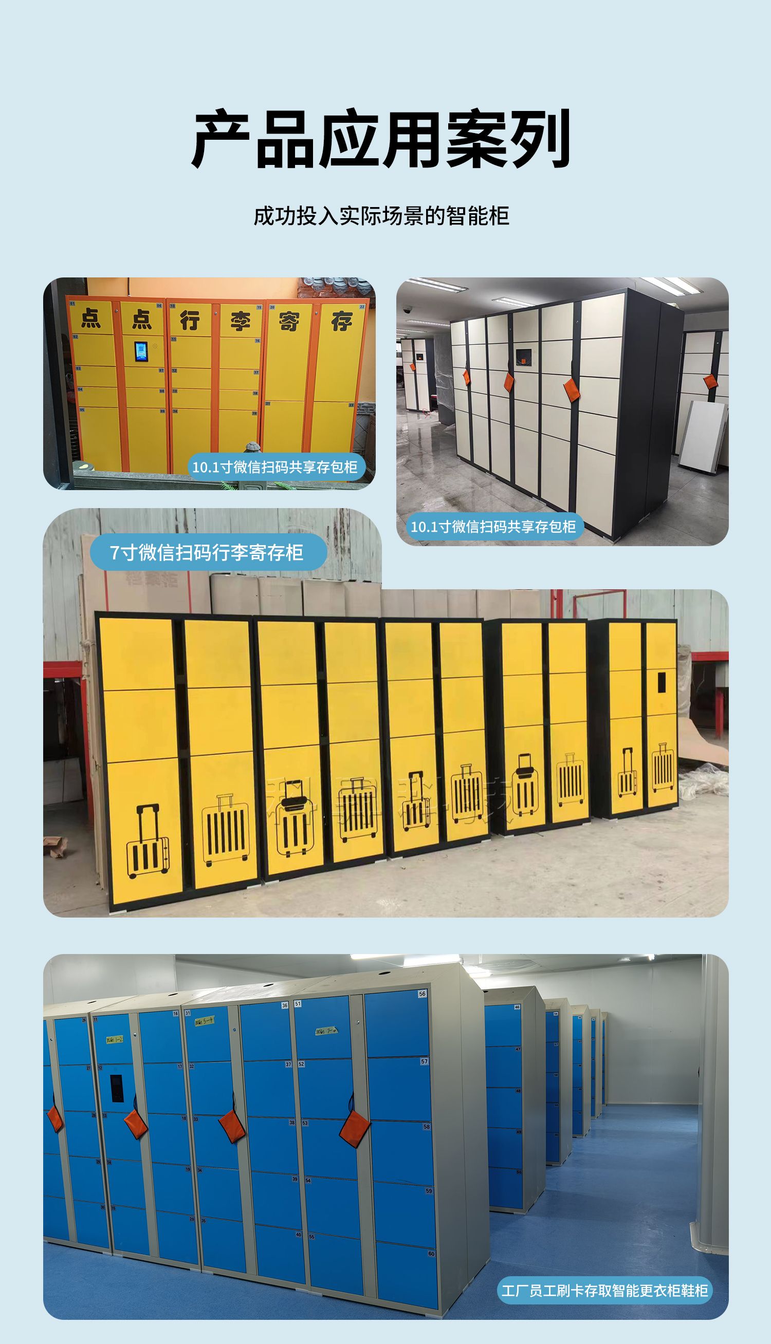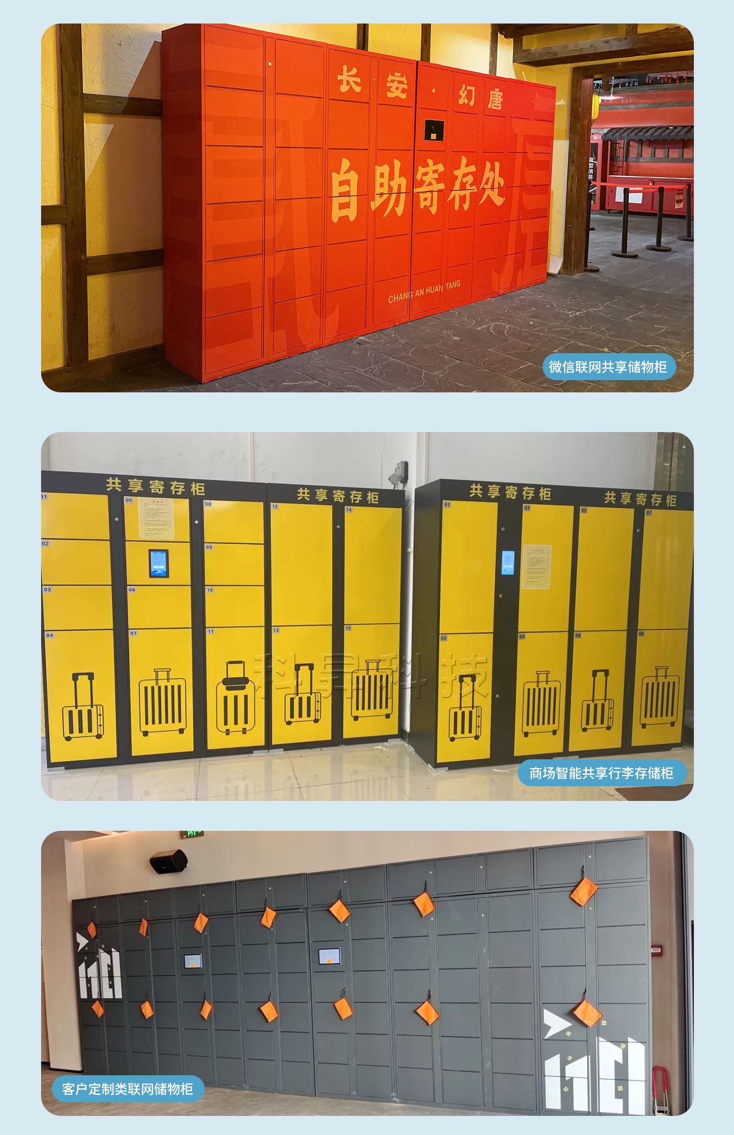 我们还生产便民工具租赁柜、体育用品租赁柜、智能快递柜、智能取餐柜、智能储物柜、单机电子存包柜、智能文件管理柜、智能装备柜等。我们有多种案例,丰富的经验,支持定制,欢迎前来咨询~~~