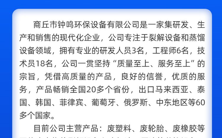 | 处理原料 | 轮胎、橡胶、塑料、铝塑、油泥等 | ||