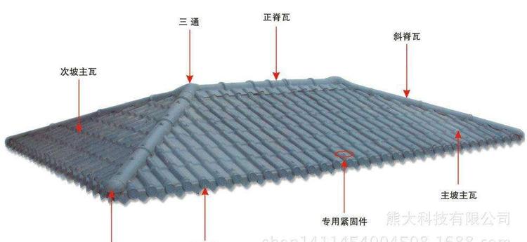 合成树脂瓦,是运用高新化学化工技术研制而成的新型建筑材料,具有重量轻、强度大、防水防潮、防腐阻燃、隔音隔热等多种优良特性,普遍适用于开发区平改坡、农贸市场、商场、住宅小区、新农村建设居民高档别墅、雨篷、遮阳篷、仿古建筑等。合成树脂瓦规格为1050mm-960mm-或880毫米-800mm。