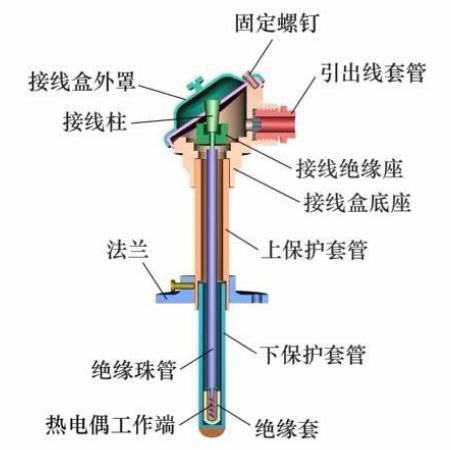 装配式热电偶主要由接线盒、保护管、绝缘套管、接线端子、热电极组成基本结构,并配以各种安装固定装置组成。
