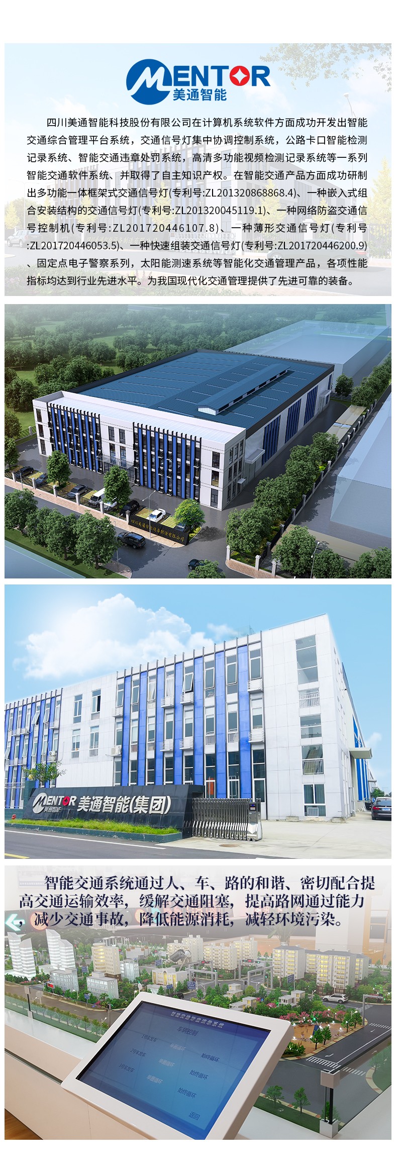 四川美通智能设备制造有限公司是四川美通智能科技股份有限公司的全职子公司,官网http://www.scmentor-itc.com/,主要经营领域包括LED交通信号灯、交通控制器、交通视频监控、LED诱导屏、标志标牌、交通信息采集与处理、停车管理与诱导以及综合交通管理等方面,并重点发展解决方案和系统业务。基本目标在于实时响应交通现状、通过有效的控制、管理与诱导措施,尽量减少道路交通拥挤与堵塞、缩短通行时间、提高交通效率。