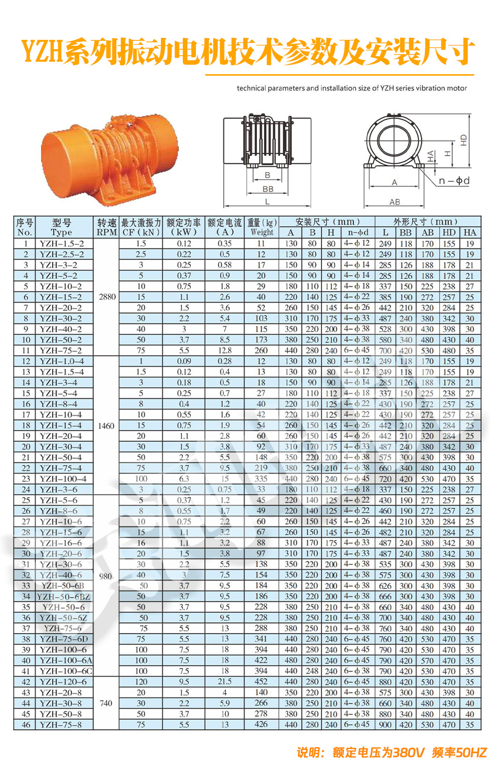 YZH-100-6A三相振动电机的技术参数包括:
