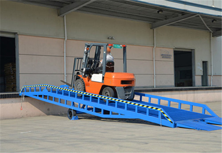 移动式液压登车桥是与叉车配合使用的货物装卸辅助设备,可根据汽车车厢的高低调节高度,叉车可以借助本设备直接驶入车厢内部进行批量作业,既能实现货物的安全快速装卸,又能减轻劳动强度,提高作业效率,加快物料流通速度。移动登车桥的体积和承载能力远远大于固定式登车桥,比较适用于大型物流中心。该设备采用手动泵作动力,1人即可操作,不需动力电源。