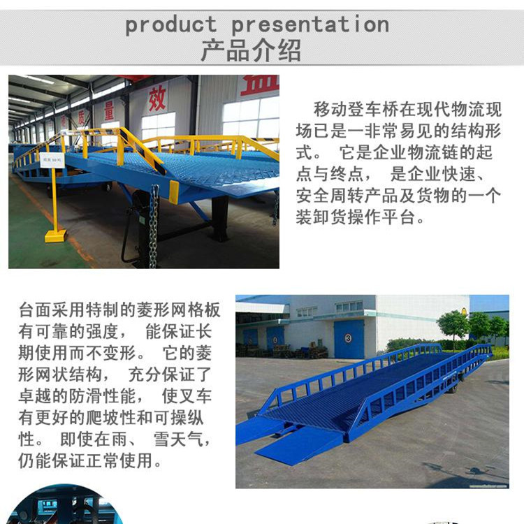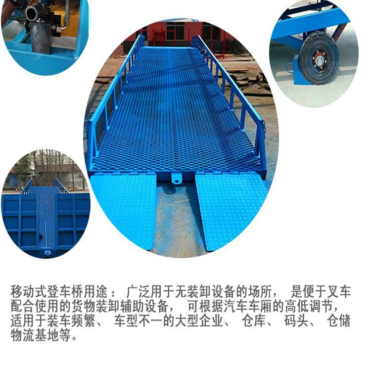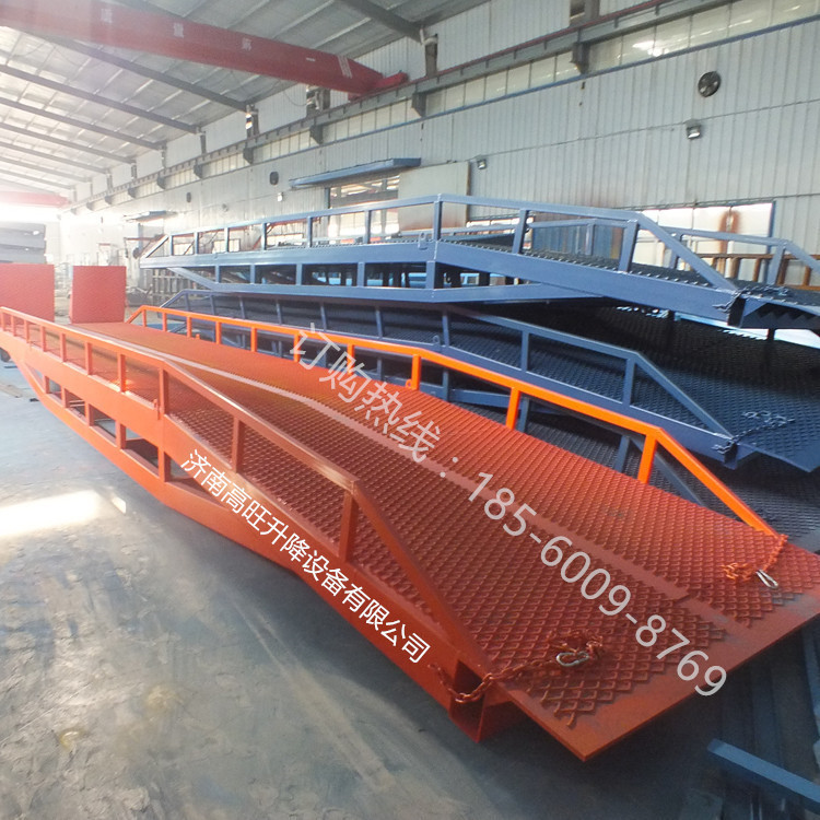 济南高旺升降设备有限公司生产的移动登车桥桥面采用特制的防滑花纹钢板或者菱形网格板,强度大,耐磨性高,能够保证长期使用不变形,优良的防滑性能,既能满足了叉车爬坡需求,又能保证在雨雪天气的正常使用。配置的刹车垫可有效防止叉车装卸时登车桥移位,增加了登车桥的安全性能。