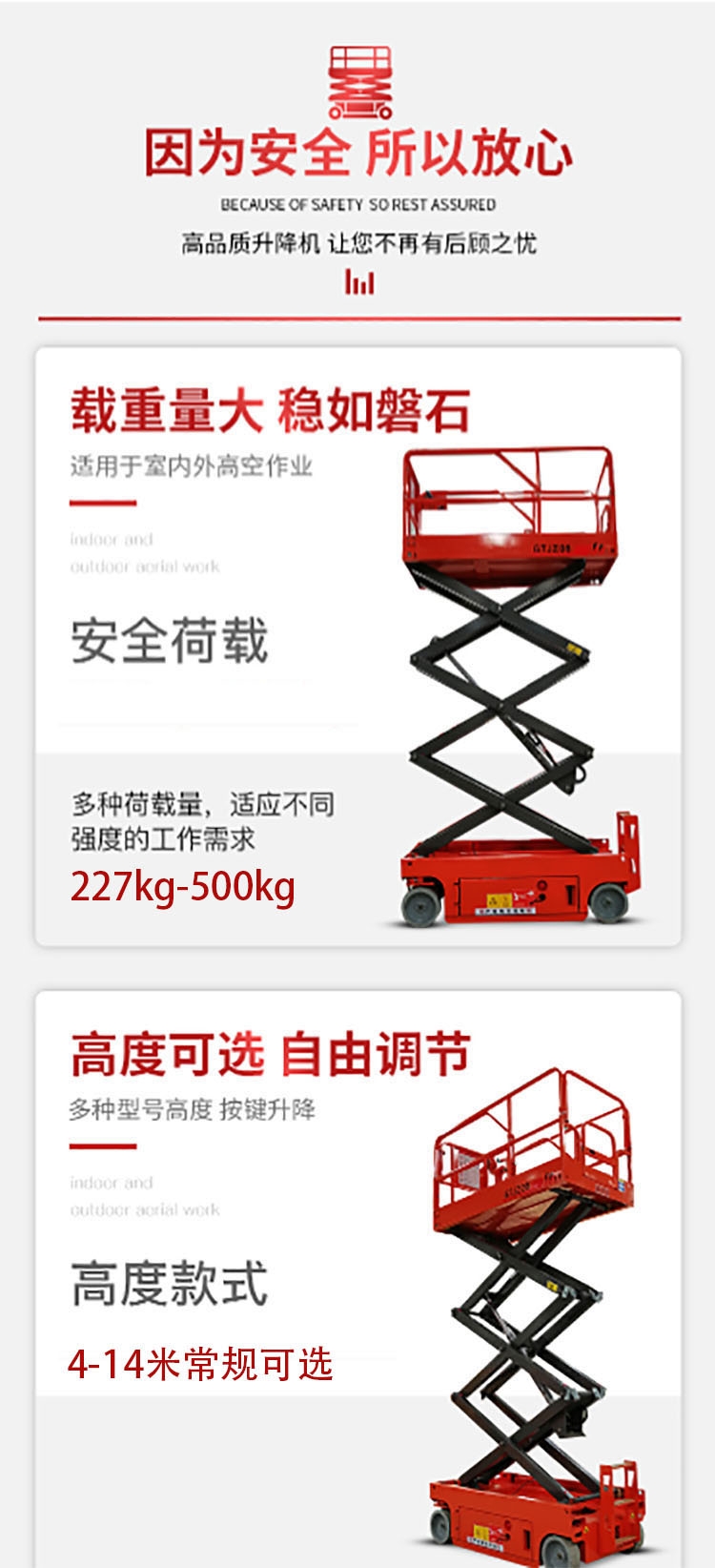 全自行(自行走)升降平台是一种多功能高空作业设备。起升高度从4米至14米不等。可根据个人要求定做特殊规格的自行式升降平台。 自行式升降平台采用优质结构Q235型材,单面焊接双面成型工艺,原装进口液压泵站或国内合资液压泵站,升降机装有平衡阀、自动保压等安全装置,平台安全可靠耐用。
