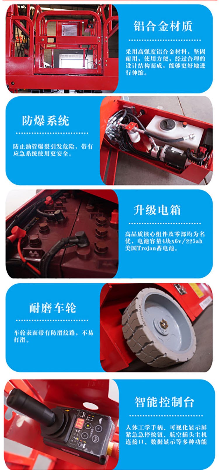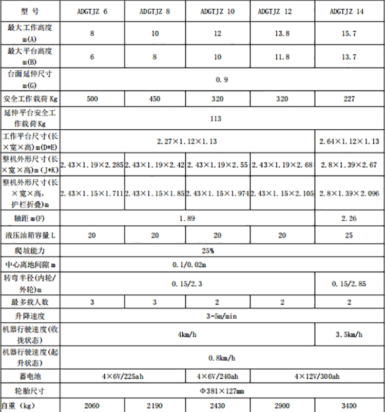 全自行平台结构坚固,使升降平台的偏转与摆动极小。具有自动行走功能,采用电瓶控制行走,能够在不同工作状态下,不需外接电源,手柄控制行走, 行走速度可调,移动灵活、操作方便、升降自如,只需一人便可完成前进、后退、转向、快、慢速行走和上下等动作,省工、省力。可根据用户使用要求设计生产。