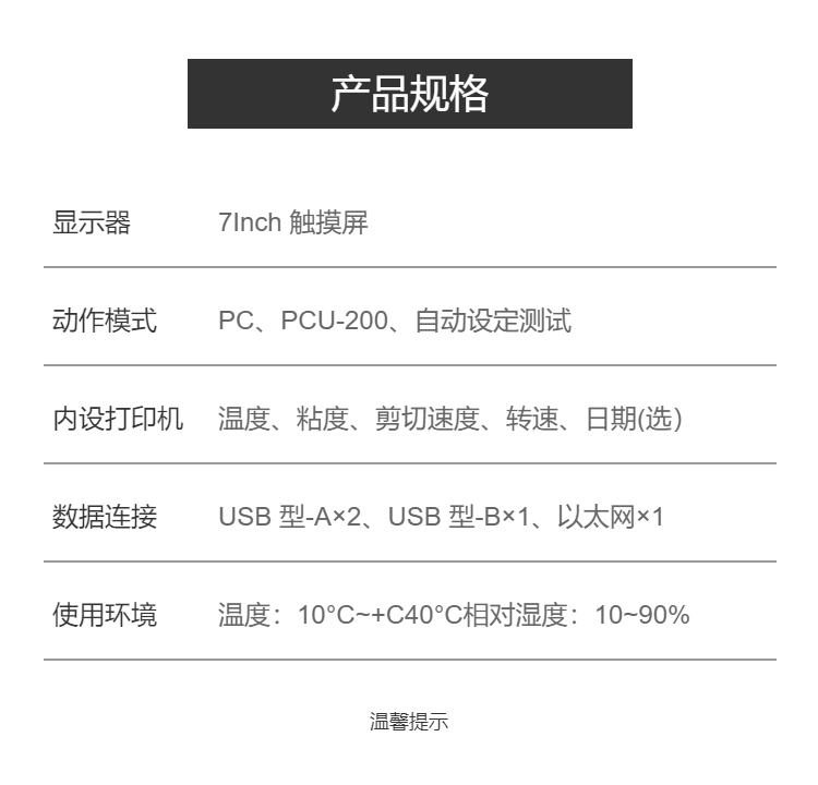 | 内置打印机 | 温度、粘度、滴落速度、转速、日期 | ||
