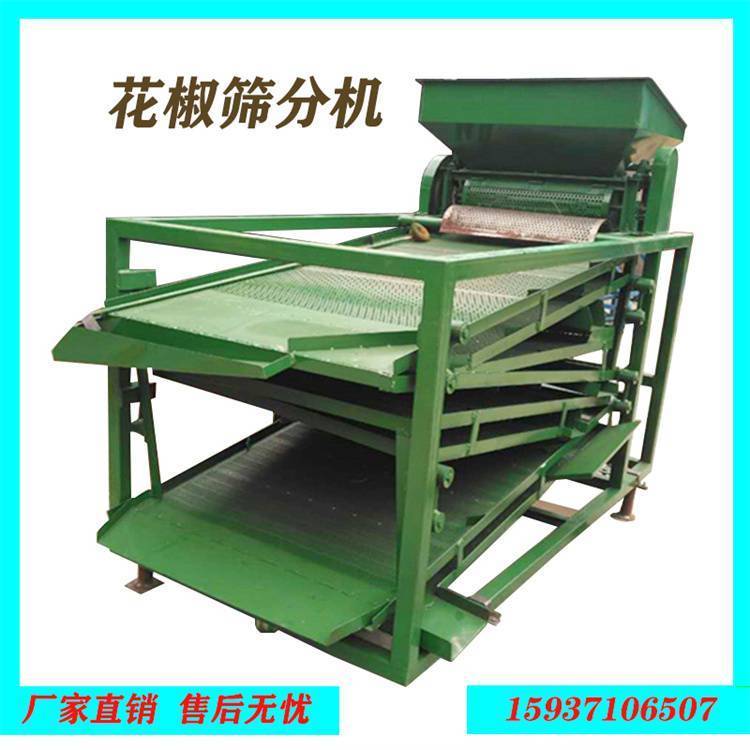 ? 机器打开----放入物料----口袋装成品花椒(筛花椒杂质的筛子可将花椒中的椒籽、椒杆、椒叶、尘土等杂质分别清选出来。同时按花椒颗粒大小进行分级,取代繁重的人工清选分级工作。用于花椒脱粒、清选、分级、去杂的机械。)