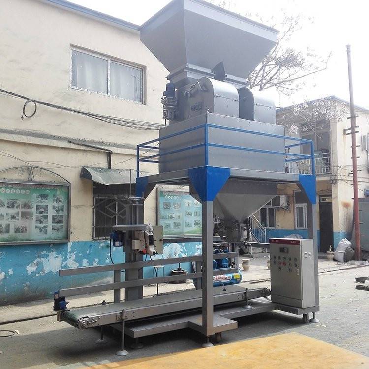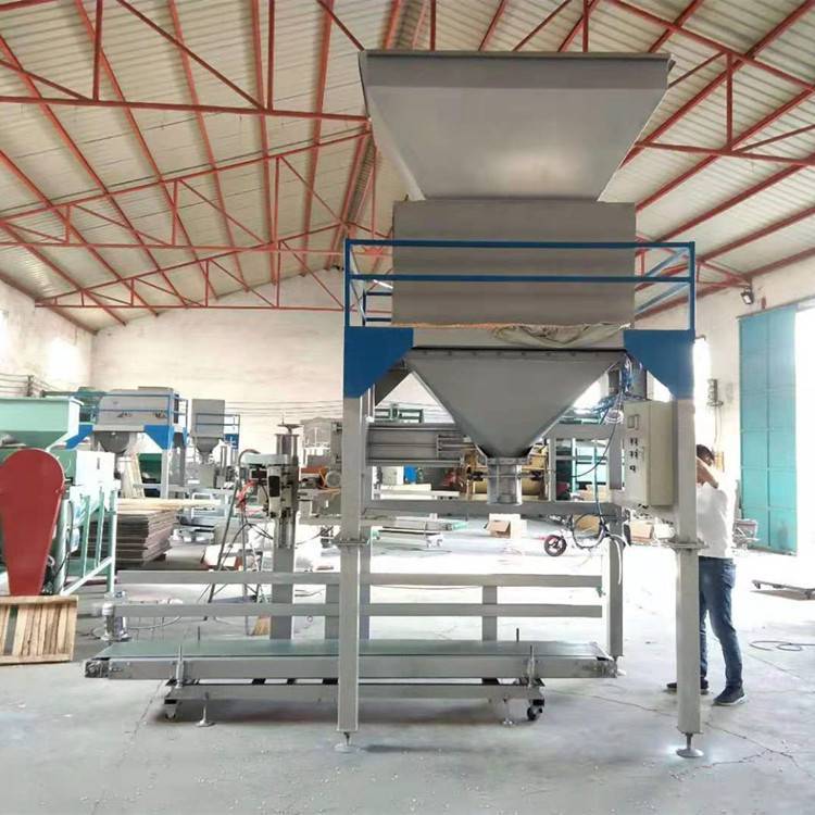 单称定量包装机:一个称重装置,自动下料打包口360-480包/h 自动定量下料打包缝口输送为一体的包装机。