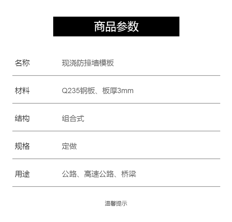 | 产品 | 现浇防撞墙模板 | ||