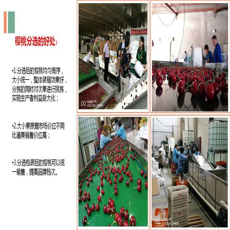 大樱桃预冷分拣机厂家采用了直径分选技术,结合新老客户的宝贵建议,不断地实验,不断地改进,研制了 大樱桃预冷分级机,不但替樱桃果农们解决了樱桃在采后处理时需要面对的各种问题,还提高了樱桃果农们的直接利润收益。大樱桃采后处理分选的升级,提高了果品的商品率和品质。让消费者知道,中国有比智利车厘子更 的国产大樱桃。