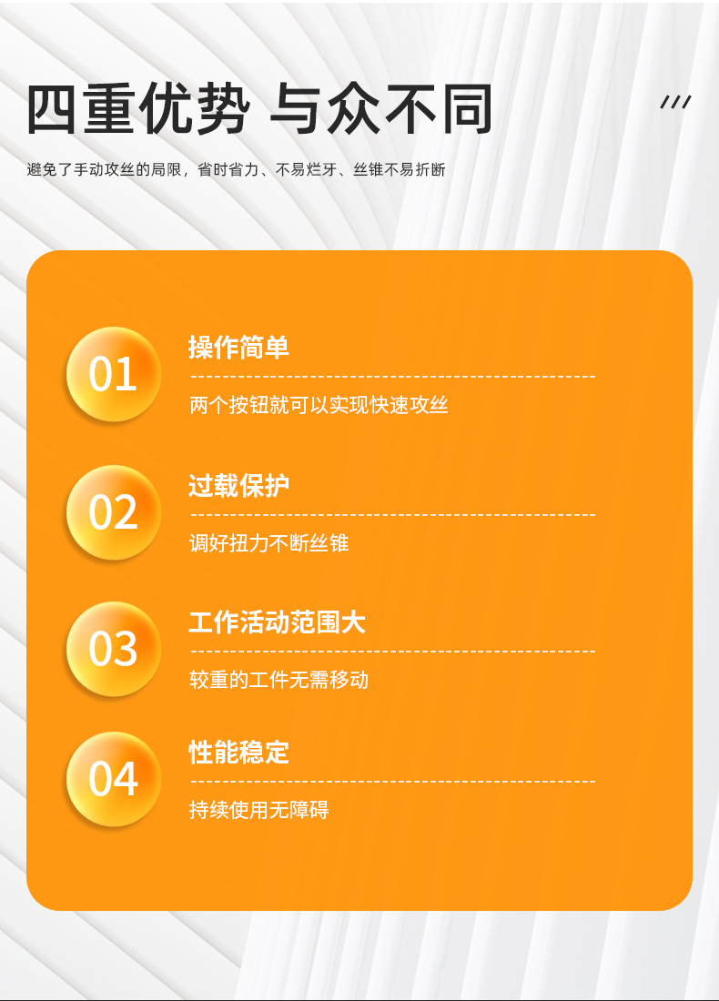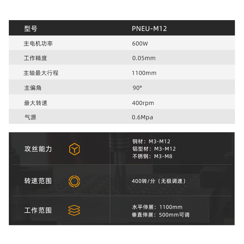 | 攻丝能力 | 钢材:M3-M12 | ||