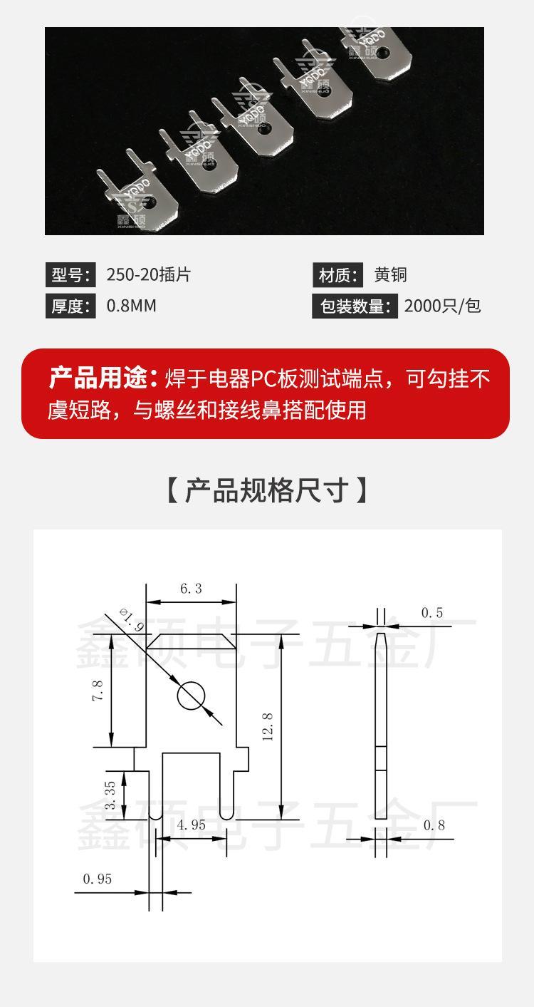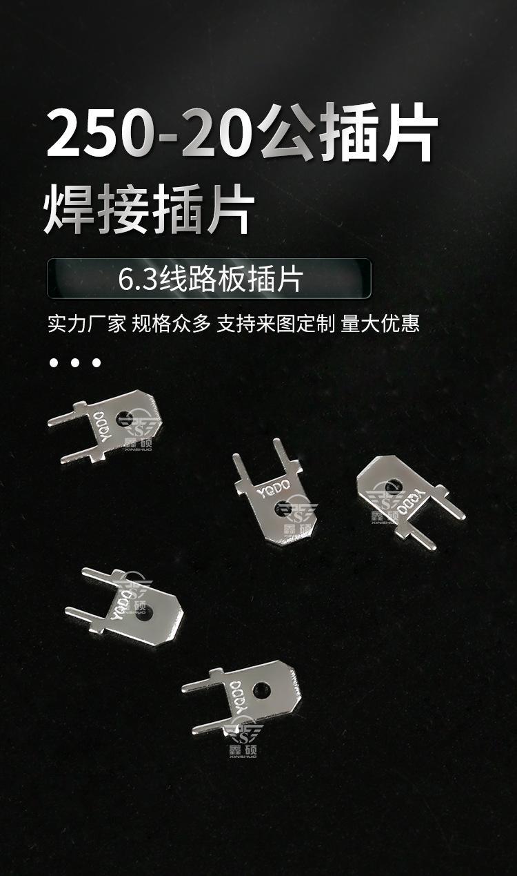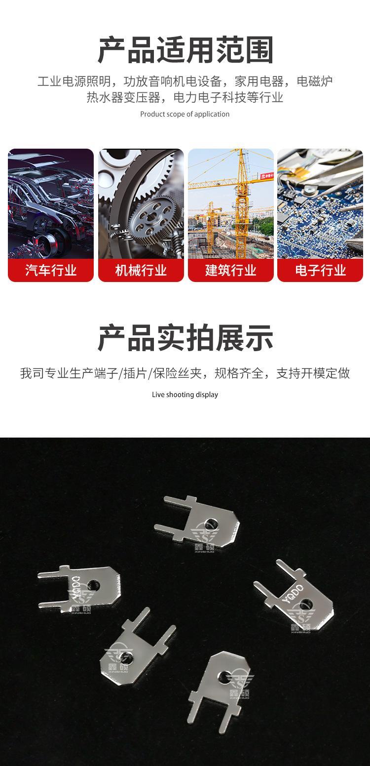 ? ? ? 厂家直销PCB焊接插片、PC板接线端子、弹片及各种物件冲压件。可根据客户要求定做其他规格产品,量大可以免费开模。质量保证,欢迎咨询洽谈。