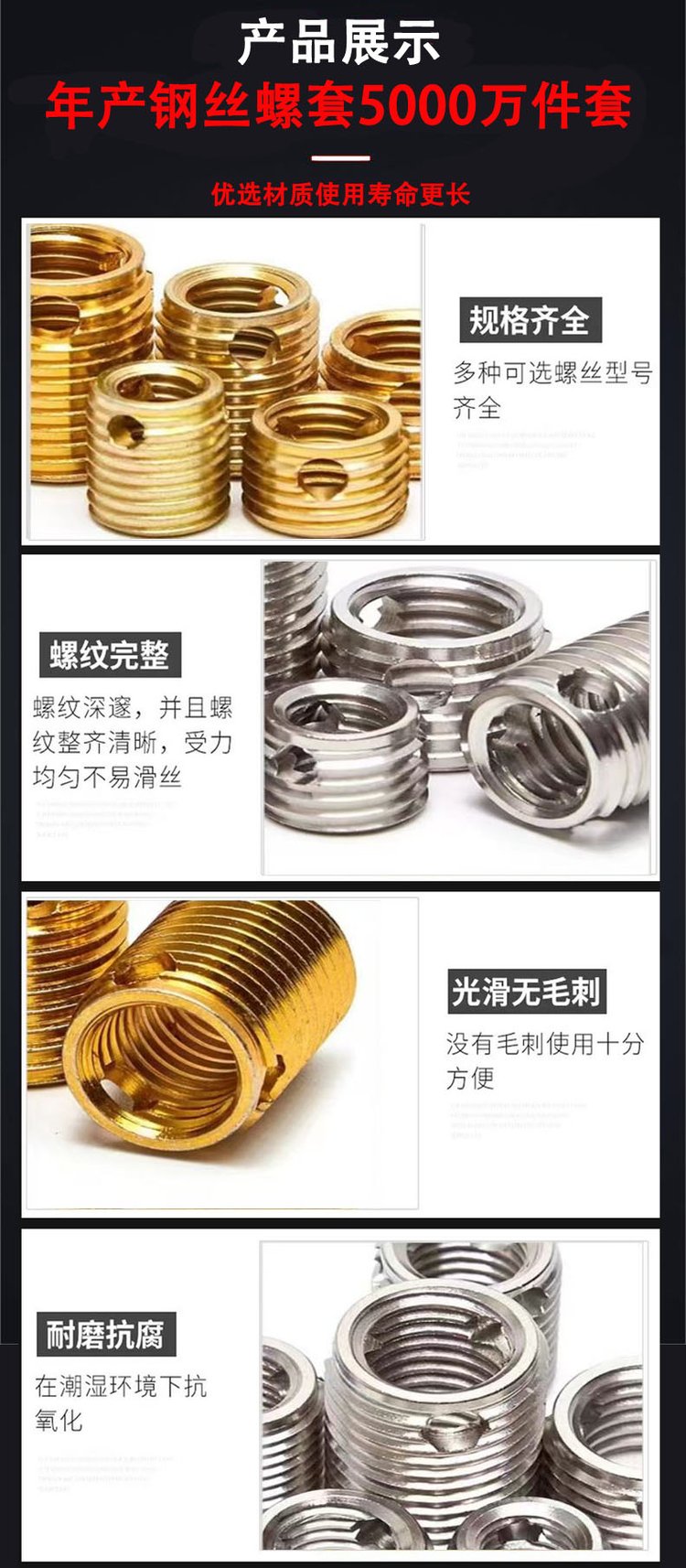 | 功能用途 | 增加螺纹强度,防止螺纹松动、螺纹孔滑牙修复 | ||
