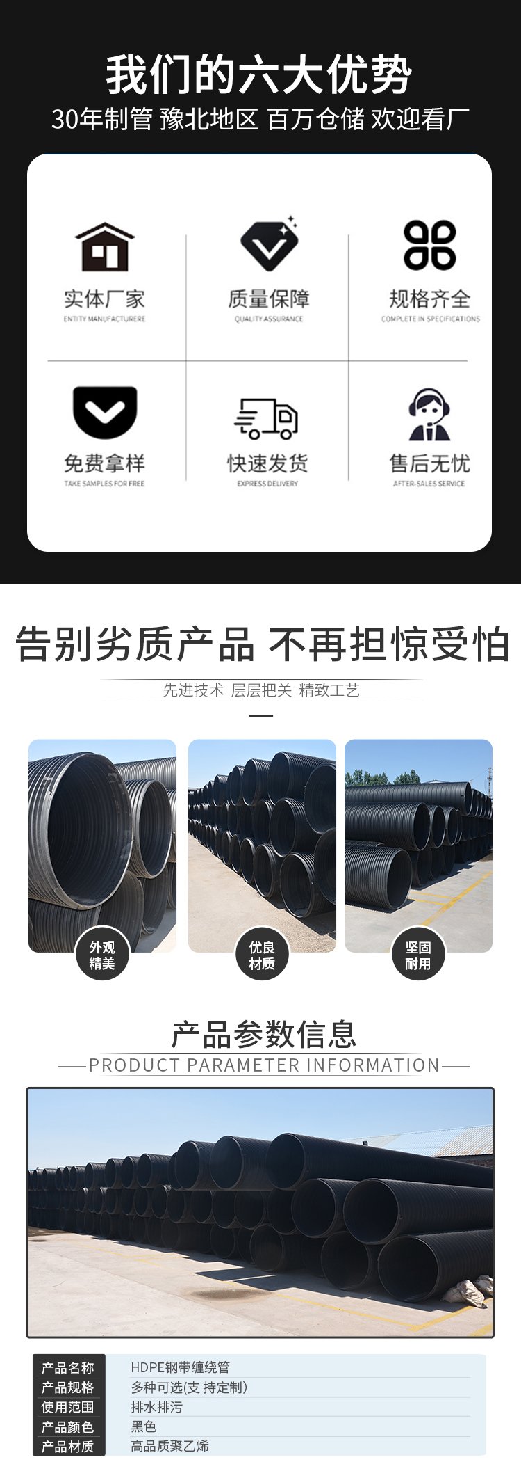 | 品名 | HDPE钢带缠绕管 | ||