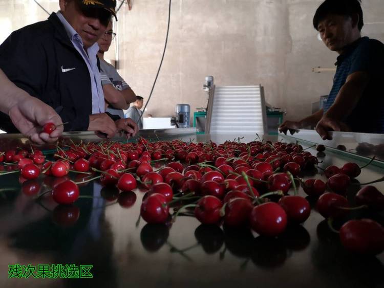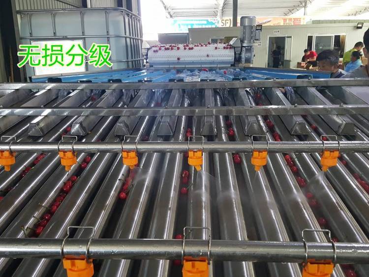水冷樱桃分选设备具有清洗、分选、分级等功能。采用平行滚轴方式将樱桃按照直径大小分开,在进入滚轴分级区域前,要安排人员在输送带两侧进行人工劈把,并将过小的果实、畸形果、腐烂果、上色不好的果等瑕疵果挑选剔除出来,在机械分级后包装前也要安排人员在传送带两侧进行第二次挑选,剔除不符合标准的果实。分级设备是辅助人工分级的,可以提高分级效率,水冷保持樱桃新鲜度,不能认为有了分级设备就不需要人工了。分级设备使用冷水来输送樱桃,水的消毒也要按照预冷水的消毒进行。