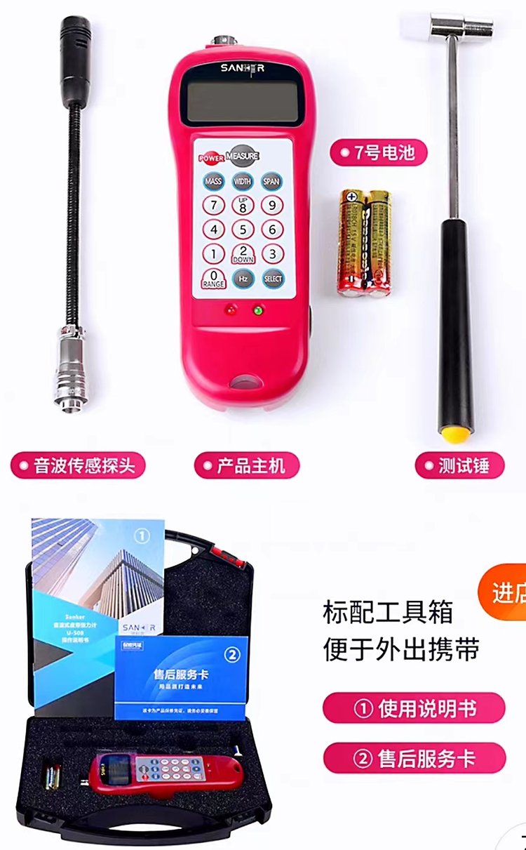 测量原理:SANKER贤科茗U-508波张力计是以声学方式测量传动带静态张力的非接触测力仪,其工作原理是通过对静态张紧状态下的皮带受冲击后振动固有频率进行测量计算处理得到皮带张力。