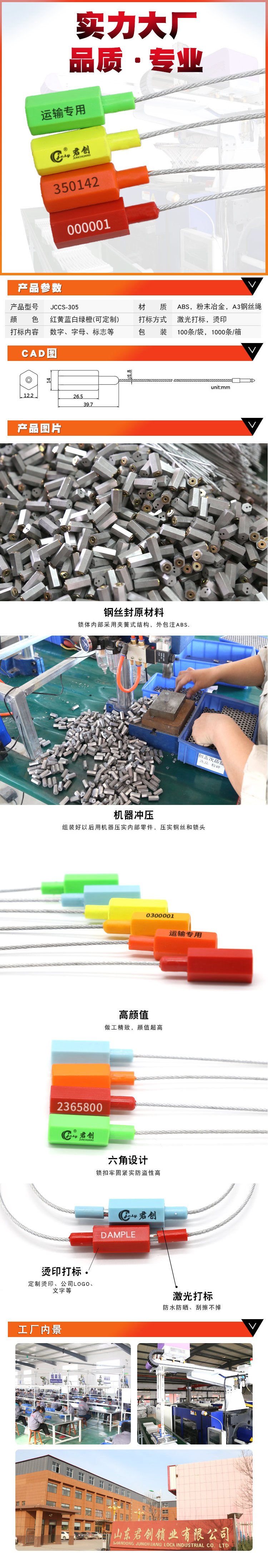 | 功能用途 | 集仪表铅封、一次性封条、高保封、电子铅封、塑料扎带、GPS定位封、周转箱等产品的研发、设计、生产、销售为一体 | ||