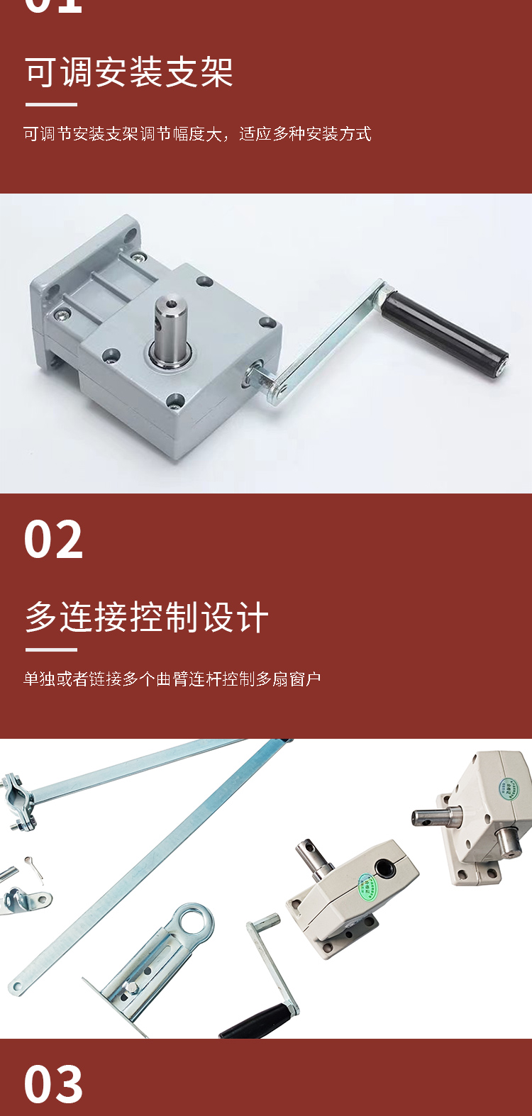 | 特点 | 可以联动带动多个窗开启关闭降低客户成本 | ||