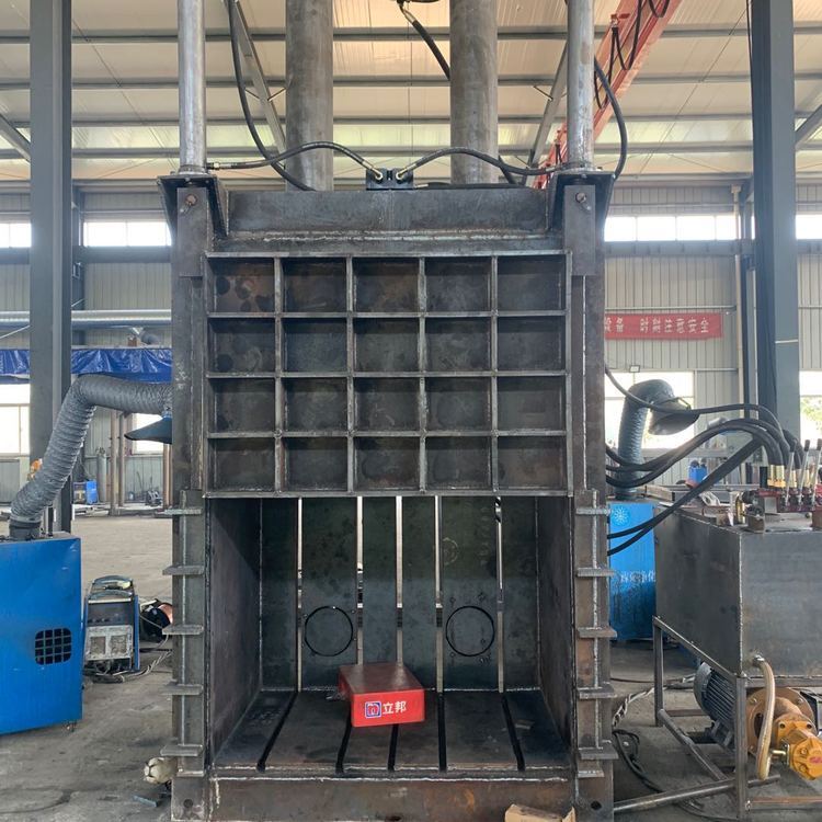 将打包物料置于打包机料箱内,液压油缸工作打压,将打包物料压缩成型,压制成各式金属包块。