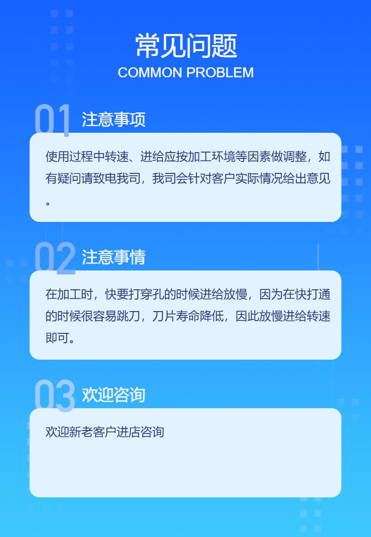 ? 使用过程中转速、进给应按加工环境等因素做调整,如有疑问请致电我司,我司会针对客户实际情况给出意见。在加工时,快要打穿孔的时候进给放慢,因为在快打通的时候很容易跳刀,刀片寿命降低,因此放慢进给转速即可。