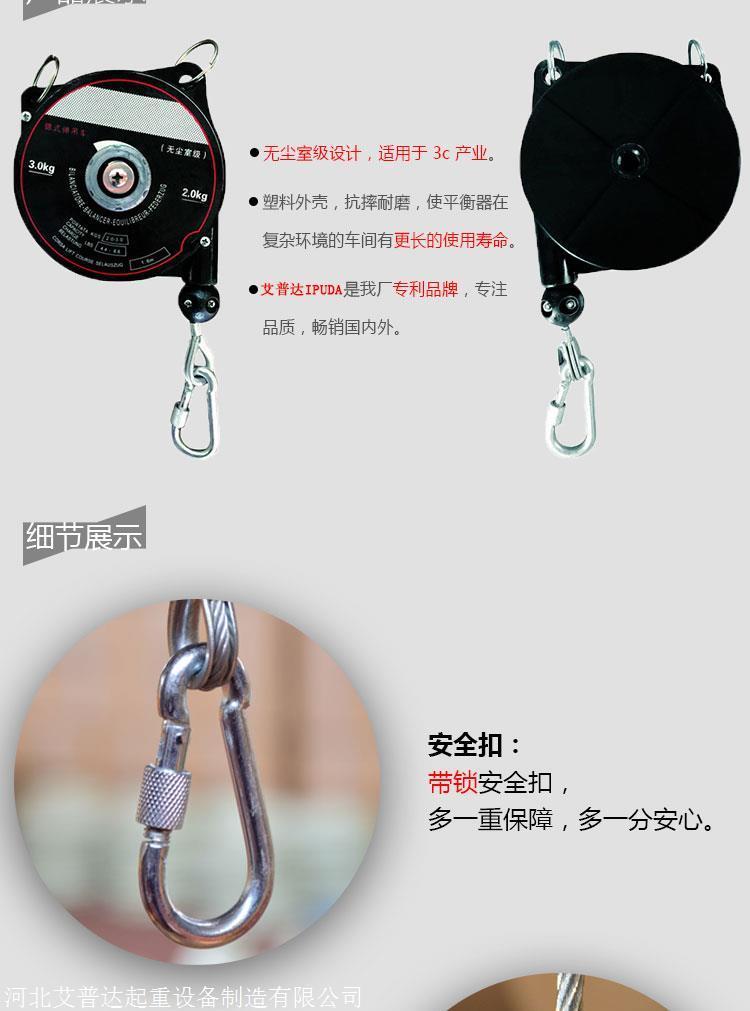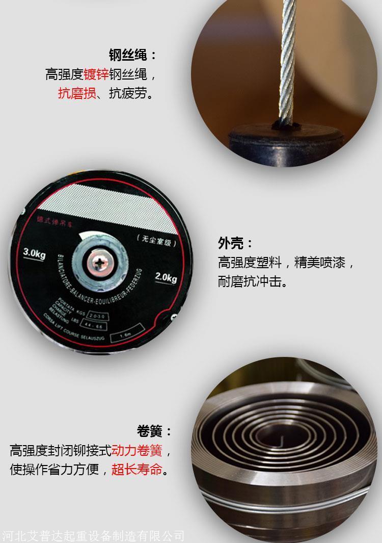 采用无尘室设计,更适用于3c产业使用 ,弹吊车配合电源弹簧线使用范围拉绳上下可活动2米,塑料外壳 抗摔耐磨 使平衡器在复杂环境的车间有更长的使用寿命 高强度钢丝绳 抗磨损 抗疲劳