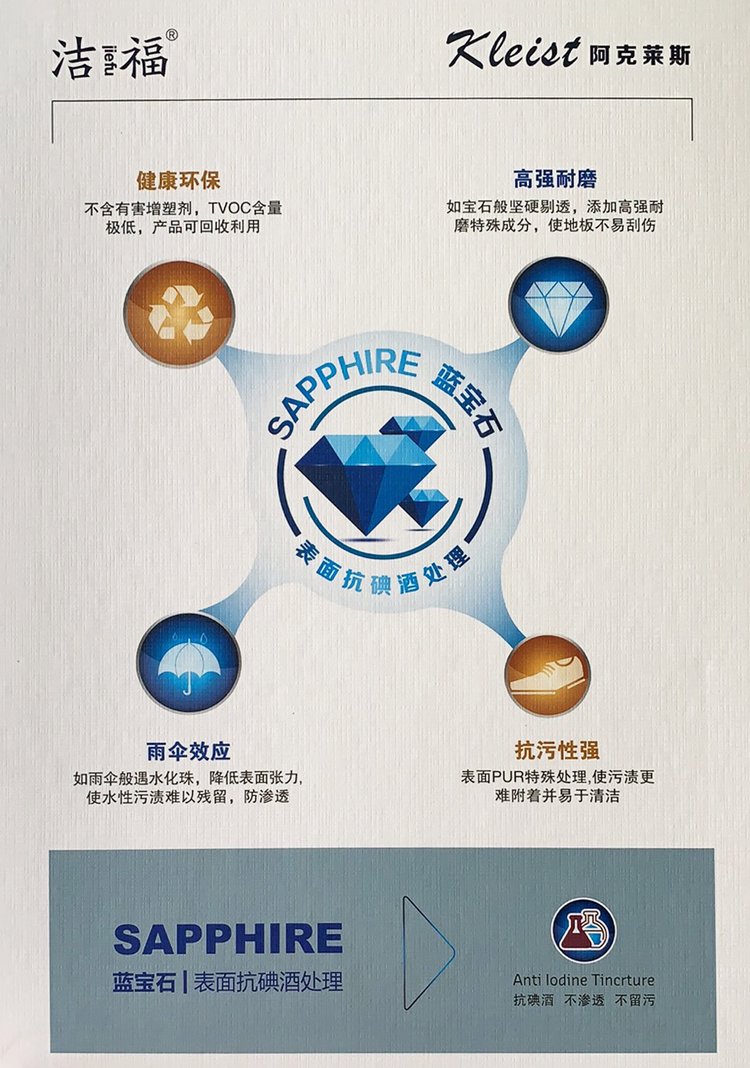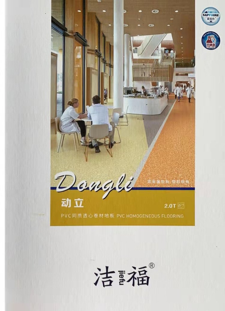 洁福动立同质透心PVC地板 具有抗菌和防霉特点,其耐磨程度达到T级,优异的耐磨性适合与客流量大的地方及经常使用化学物质及较脏污的区域。抵抗污染的坚固壁垒,卓越的抗化学试剂及污染性能,100卫生,不含任何污染物质,杜绝病菌滋生。终生无需打蜡,维护保养更便捷,对环境影响极小。