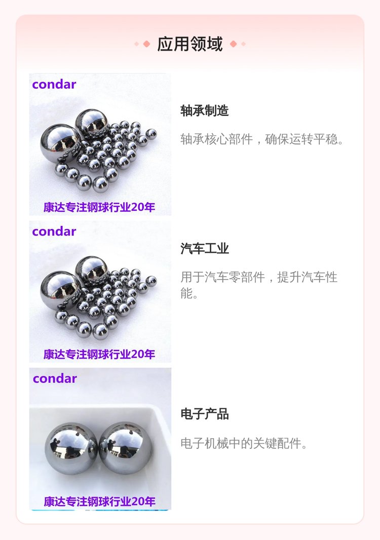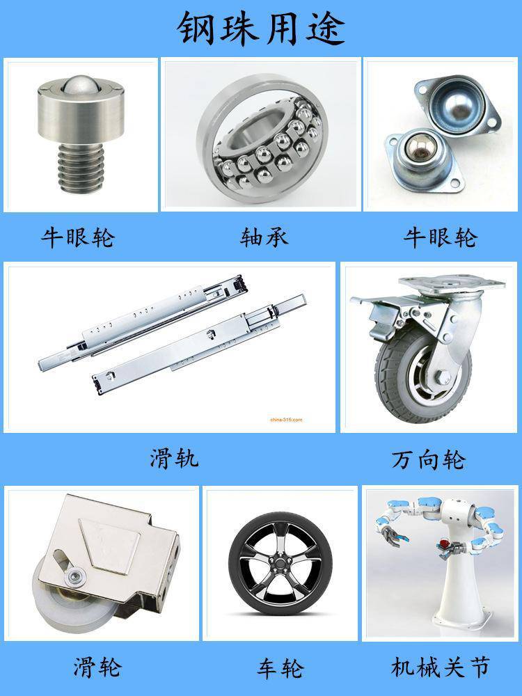 | 功能用途 | 轴承,汽车,自行车,摩托车,滑轨导轨,万向球,箱包,电子,机械配件等,也可用于研磨介质 | ||