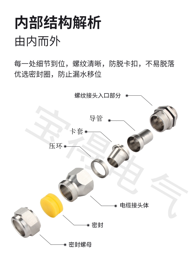 产品说明:本款不锈钢铠装防爆填料函采用优质304不锈钢原材料配合先进数控机床精加工制成,内置隔爆衬套和铠装电缆卡环,防爆功能特强,适合各类钢带,钢丝铠装电缆。电缆锁紧采用填料密封,防护性能好.具有快捷安装,安全可靠,防护性能好,防爆性能优越等特点,另抗拉力特强,可防水、防尘、抗盐、耐弱酸、酒精、油、油脂及一般溶剂,。