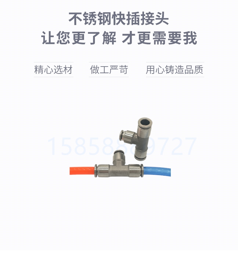 不锈钢T型快插异径三通相容性:可搭配尼龙管、PU管、特氟龙管使用,适应性水气环系统、工作母机、车床等。
