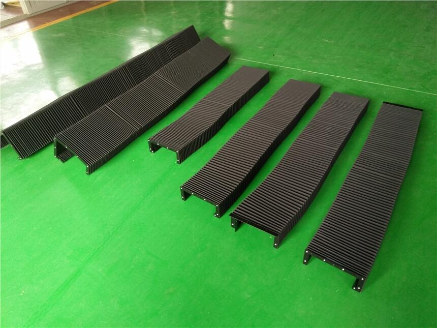风琴防护罩因为材质的不同,运用到的设备上也就不同。根据情况尼龙布能在高温90℃、低温-40℃之间正常工作;耐高温布可在100℃-200℃之间正常工作;防火布可在300℃-400℃之间正常工作,且防燃。特别高温的环境采用特殊的材质。根据设备运转情况内部结构可设计为不同的槽型,满足条件的情况下可采用滚轮、尼龙滑片、滑块、拉筋、拉簧、尼龙轴。通过使用高频焊热合机在一定的温度下,使内部的PVC骨架与外部的折页牢固地粘接在一起。使用厚度小的原材料能够使其压缩达到现代机械狭小工作空间的请求。(它的行程压缩比可达10:1)