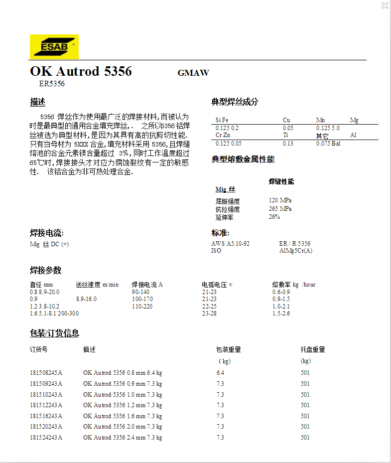 3、铝镁合金焊丝ER5356 性能特点:本品为含镁5%的合金焊丝,是一种用途广泛的通用型焊材,适合焊接或表面堆焊 5%镁的铸锻铝合金,强度高,可锻性好,有良好的抗腐蚀性。本品也能为经阳极化处理的焊 接提供良好的配色。 典型化学成份:Mg 5、Cr 0.10、(Fe+Si)0.3、Cu≤0.05、Zn 0.05、Mn 0.15、 Ti 0.1,AL余量 用途:自行车、铝滑板车等运动器材,机车车厢、化工压力容器、兵工生产、造船、航空等 行业.