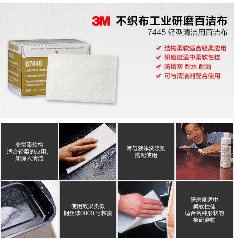 3M7445尼龙片白色尼龙菜布瓜 工业百洁布,隶属于不织布研磨产品。以特殊的纤维为基材,再接研磨矿砂而构成,具有杜特的开放式网状立体结构。 工业百洁布特性表现在: 1、工业百洁布弹性研磨,能有效地防止过度切削和刮伤工件表面 2、冷切削,独特结构有效进行散热,避免工件加工过程中由于过热而引起变色和变形; 3、工业百洁布防堵塞,耐水、耐油; 4、自锐性研磨,研磨过程中纤维不断损耗,新的研磨矿砂不断自然形成,为工件提供 始终一 致的加工品质; 目前工业百洁布主要应用于金属、木器等材料表面的涂层处理,清洁、抛光、除锈、去毛刺等机械维修与清洁,高品质外观装饰线纹处理作业中。 1.漆面处理:金属,木器等材料表面的涂层,如中漆和底漆,经过处理后增强了各涂层之间的附着力,从而有效地延长了涂层的寿命。 2.高质量的装饰线纹处理:能在多种材料表面提供外观装饰线纹,如不锈钢表面装饰纹处理、仿古铜修饰处理等等。 3.去毛刺,抛光,除锈,清洁,能彻底清 除各种材料表面地锈斑,污垢,和氧化皮等附着物。广泛地应用于焊道清洁处理,机械维修与清洁