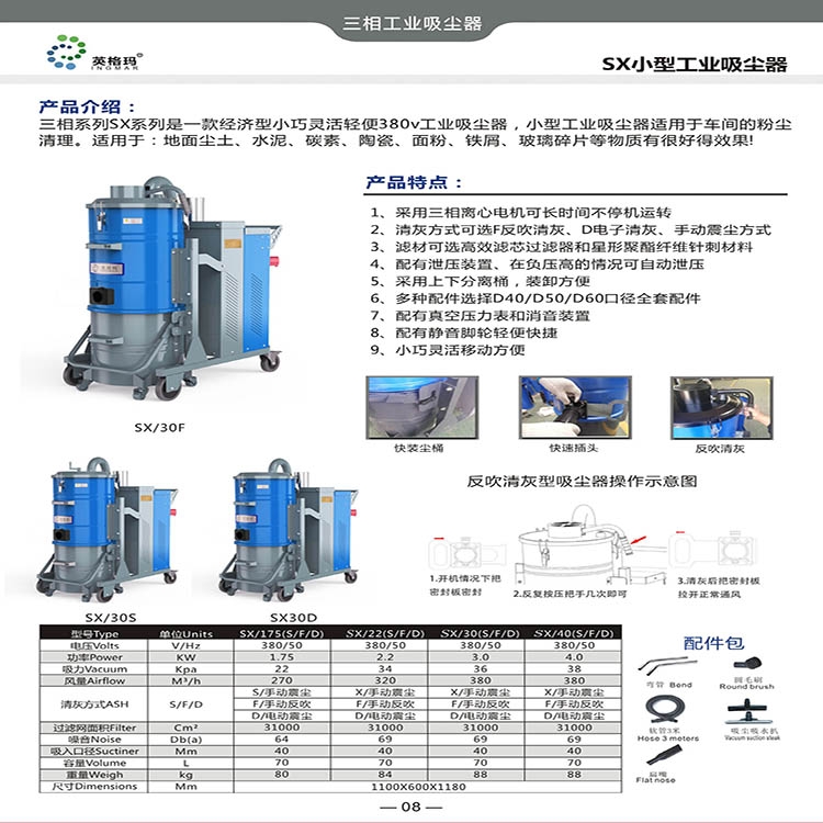 三相系列Sx系列是一款经济型小巧灵活轻便380v工业吸尘器,小型工业吸尘器适用于车间的粉尘清理。适用于:地面尘土、煤灰、水泥、碳素、陶瓷、面粉、铁屑、玻璃碎片等物质有很好得效果!可选智能清灰方式,一键启动全自动化,省时省力。推吸式更方便更高效