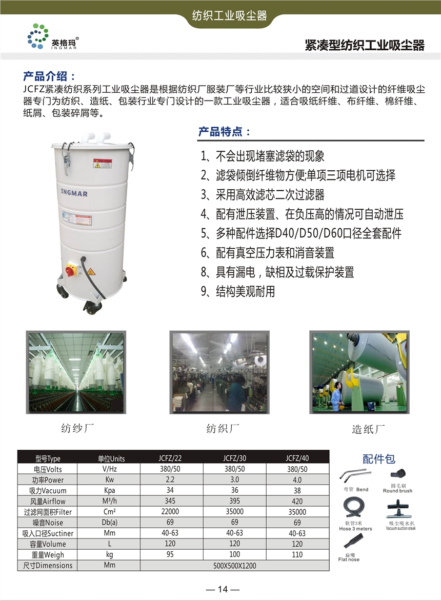 英格玛 JCFZ紧凑纺织系列工业吸尘器是根据纺织厂服装厂等行业比较狭小的空间和过道设计的纤维吸尘器专门为纺织、造纸、包装行业专门设计的一款工业吸尘器,适合吸纸纤维、布纤维、棉纤维、纸屑、包装碎屑等。
