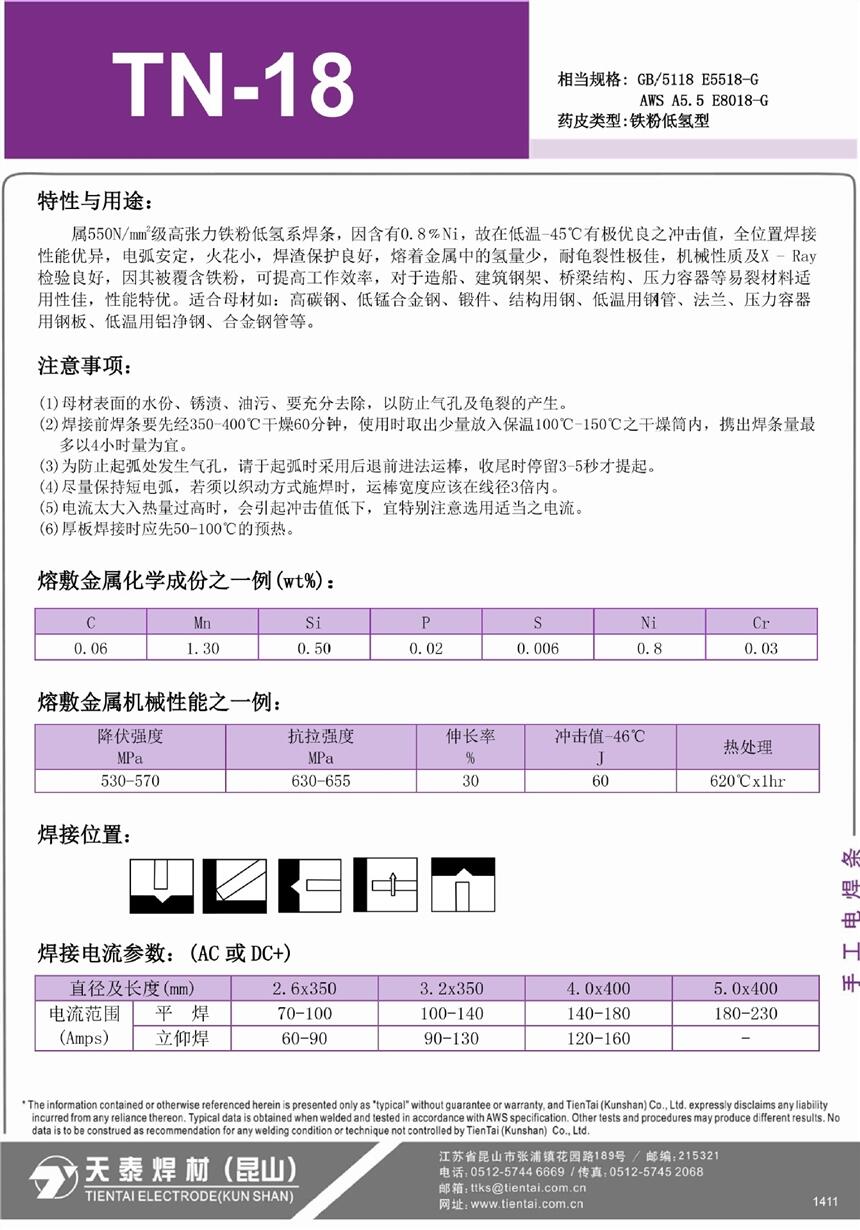 昆山天泰低温钢焊条TN-18/E8018-G低温钢焊条