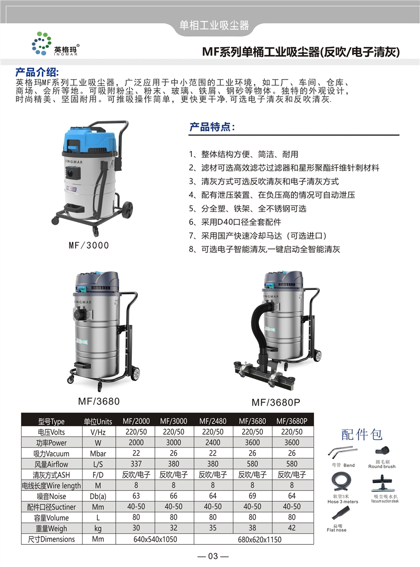 英格玛MT系列工业吸尘吸水机,广泛应用于中小范围的工业环境,如工厂、车间、仓库、商场等地。可吸附粉尘、粉末、玻璃、铁屑、水、钢砂等物体。独特的外观设计,时尚精美、坚固耐用。配备快速冷却的静音马达,吸力强劲,可推吸操作简单,更快更干净。