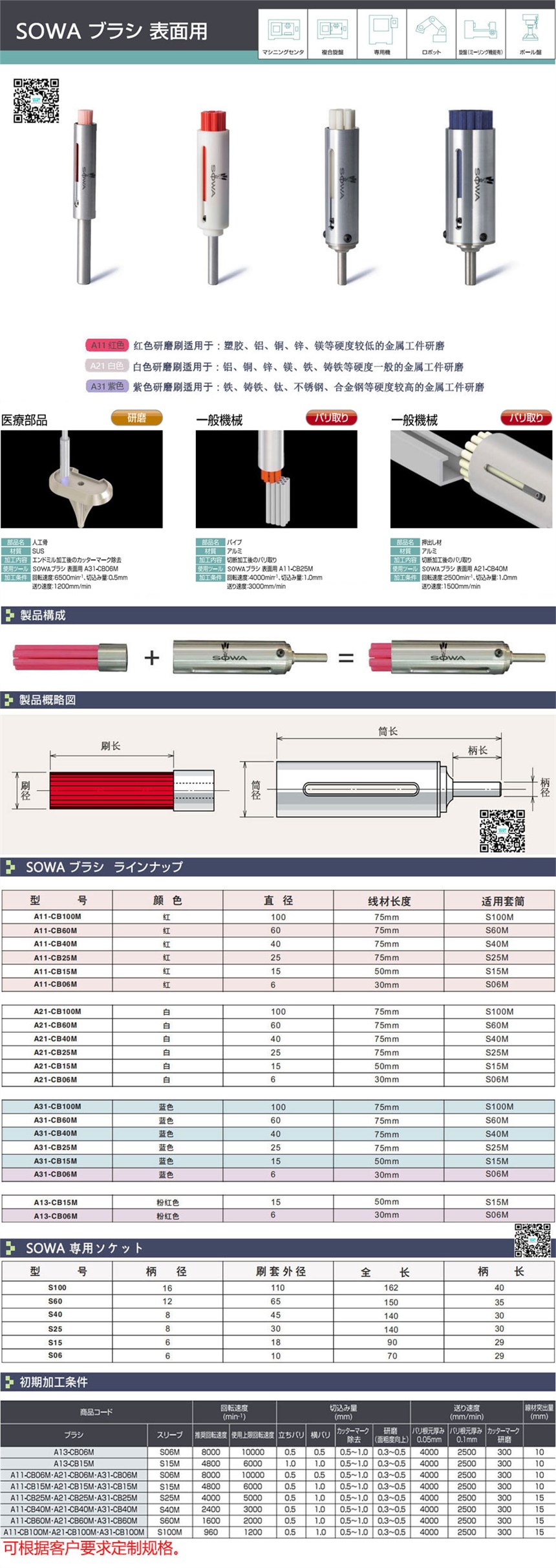 SOWA陶瓷纤维研磨刷的研磨能力是带有磨粒的尼龙刷的60倍。 常规刷子的形状会因使用过程中的膨胀和收缩而变化,但SOWA陶瓷纤维研磨刷的形状不会改变。它保持稳定的磨削力,并支持去毛刺和去除工具标记的自动化。