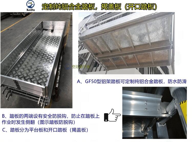 二.配置:铝合金脚手架产品基础框架配置是由基础焊接框架以及4只可调节脚轮,6条长的横杆,2条斜杆,1个1.8米开口踏板,2个围栏(防护栏)组成。其次就是斜支撑,斜挂梯,平台板。(其中脚轮,围栏和平台板非铝合金材料制成,它们的制作成本也是决定铝合金脚手架价格的一部分)。