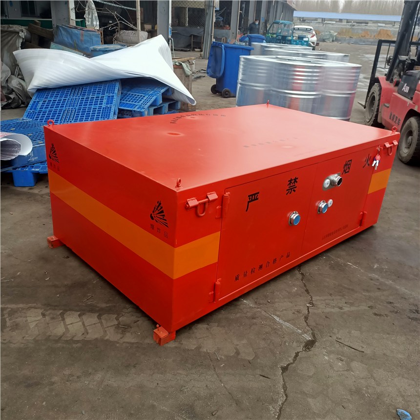 该产品采用优质钢板,木板和防震阻燃毡垫等材料制作而成,具有抗压、防爆、耐磨损等特性。外观颜色可根据客户需求来选择,一般可做白色,黄颜色,蓝色,红色等比较醒目的颜色,箱体喷涂有“爆炸”或者“危险品”等警示性标语。箱体上部四角焊接吊环,方便起吊装卸车厢,