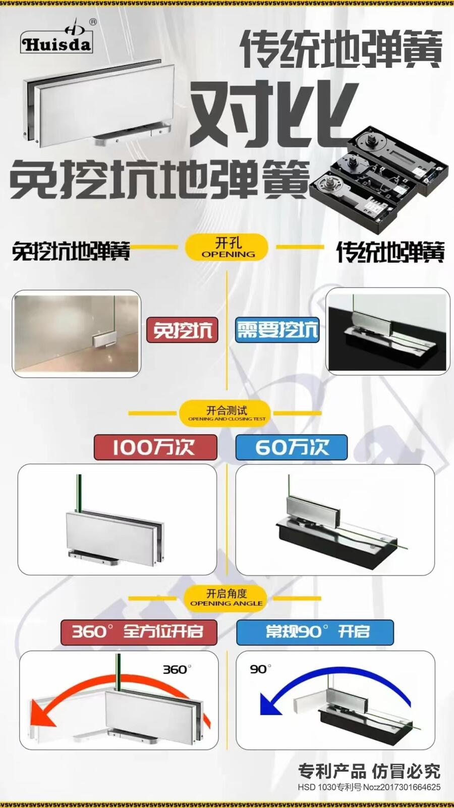 众所周知,日常我们在办公、商场、酒店大门等场所经常看到的玻璃门(暗藏在地面的开关自动闭门装置),它们都是需要开槽挖坑嵌入用水泥固定安装好的,其施工起来比较繁琐废时,那么有没有一种可以节省时间且快装达到一样的使用效果呢?下面就跟随辉士达韦生一起来了解一下免挖坑地弹簧这款产品吧。