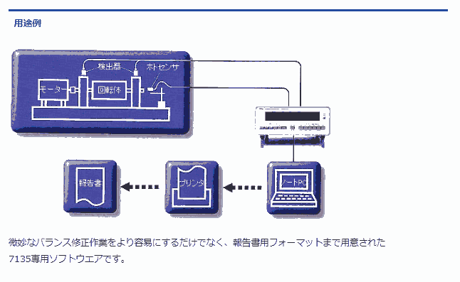 Model-7135Aは、フィールドバランサとして180~30,000rpmまでの回転機に対応します。また、加速度センサ、速度センサ、非接触変位センサを使い分けることができ、ベクトル出力も備えていますので、X-Yレコーダでポーラル図が描けるなど、振動計や振動モニタ、回転計としても使える高い汎用性をもっています。