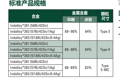 合金 铟泰公司生产58Bi/42Sn共晶合金的低氧化合金粉末,主要 是行业标准的3号粉和4号粉。其他尺寸可按需提供。金属 比指的是焊锡膏中助焊剂与焊锡粉的重量比,数值取决于 粉末形式和应用,一般在83%–92%之间