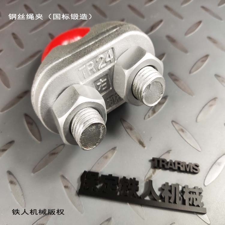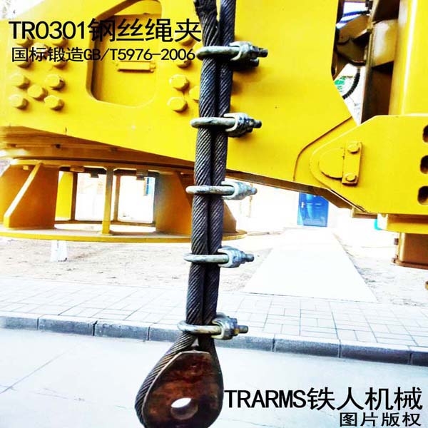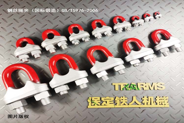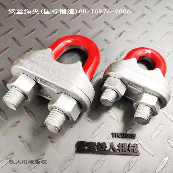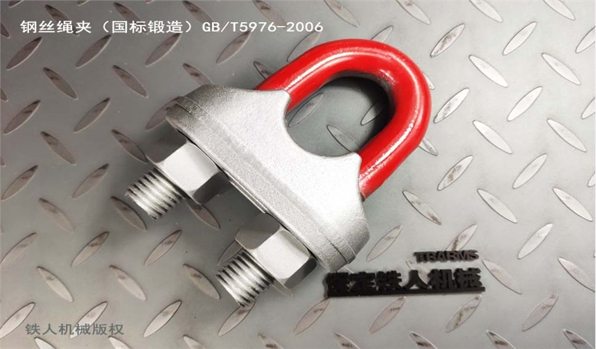 1.铁人机械钢丝绳夹(国标锻造)特点:满足GB/T5976-2006, 与钢丝绳栓结稳固。内部组织结构紧密,机械性能优良。 相较灰铸铁绳夹,钢丝绳夹(国标锻造)经破坏性重压试验,夹座部分产生塑性变形,不会破碎。