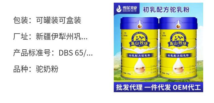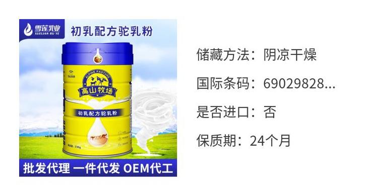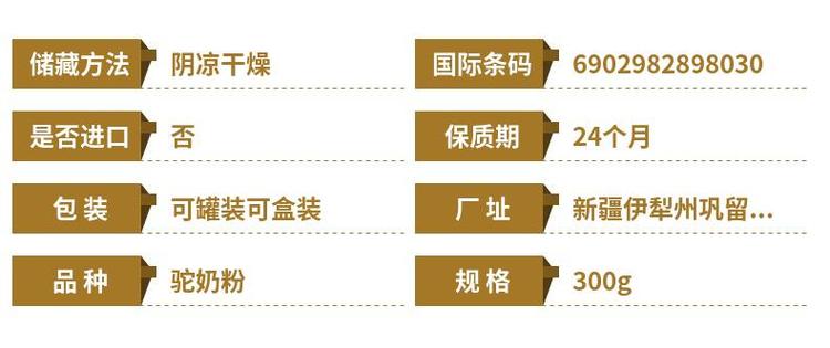 | 配料表 | 全脂驼乳粉、水解蛋黄粉、DHA、乳铁蛋白、叶酸、牛磺酸等 | ||