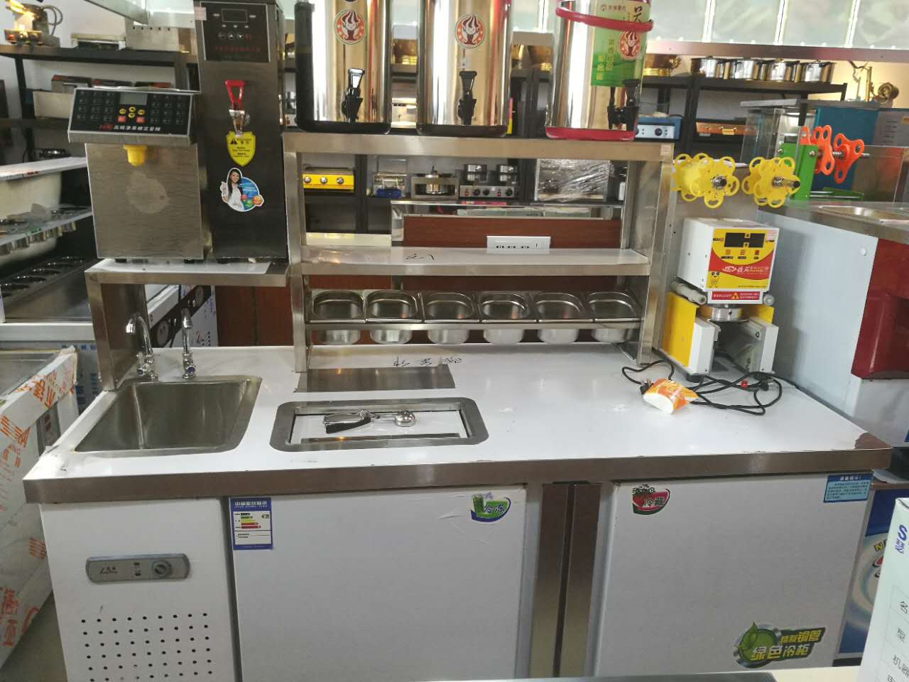 主要用途是烧热水泡茶。不要小看这个设备,以为泡茶可以自己烧水来泡,那你就大错特错了。茶是奶茶店的主要原料,极少有产品中没有茶,因而它的用量很大。用热水器能保证热水随时供应,自己烧热水不