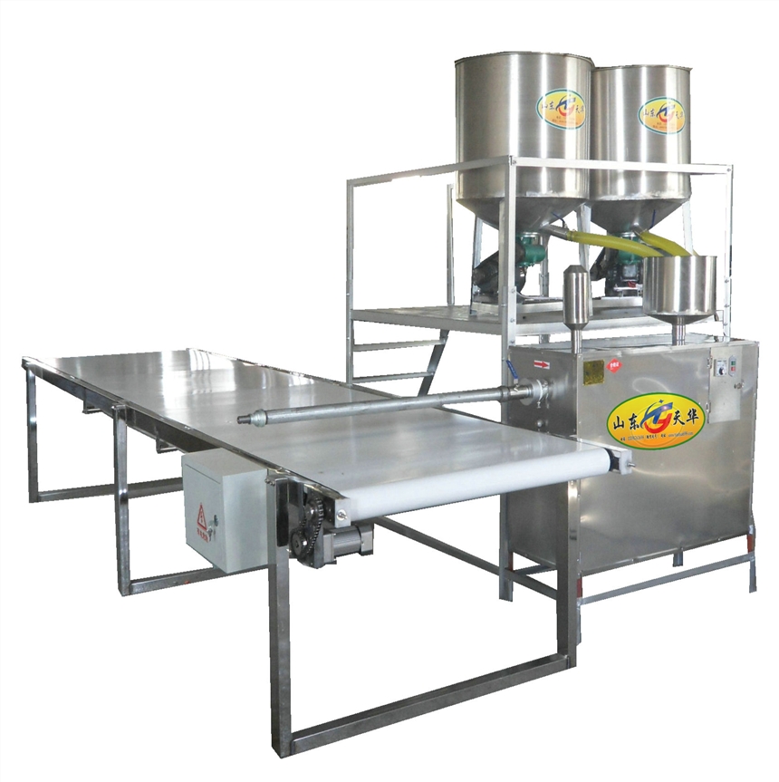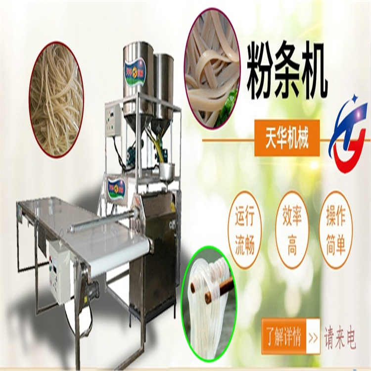 天华粉条机组全自动粉条生产线为机电一体化设计,操作简便,安全卫生,由工作台、不锈钢搅拌和浆机、粉条成型机、皮带输送机和电机组成,采用智能控温新工艺熟化成型方式,仪表显示温度,使淀粉糊化温度恒定,加工粉条不用明矾不加胶,电热自熟不烧煤,无烟尘排放,干净卫生,生态环保,节能省工,且粉条粉丝筋道,下锅不糊,提高了粉条粉丝的市场竞争力,原料范围广,薯类淀粉及各种粮豆类淀粉米浆都能加工。天华牌粉条机加工产品多样化,粉条粉丝扁粉粉皮酸浆米线东北酸汤子等不同粗细扁圆宽窄换不同的成型模具即可实现。天华全自动粉条生产线采用排线平行出粉工艺,平行出条,条与条之间有间隙,不接触,冷却后即可挑杆晾晒,无需冷冻,无需搓洗分条,一年四季均可生产,它打破了传统做粉方法,开创了免冻免搓洗粉丝粉条的先河,生产简单易操作,淀粉加水和成稀浆倒入机器内熟化成型即可,粉条出机即熟,且相互之间不粘连,漏到接条膜上切断后即可调杆冷却晾晒,抛弃了传统工艺打芡打糊,冷冻搓洗的笨重方法,减轻了劳动力。