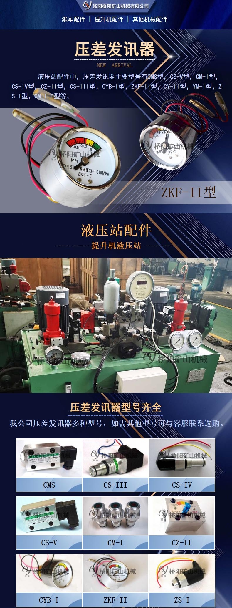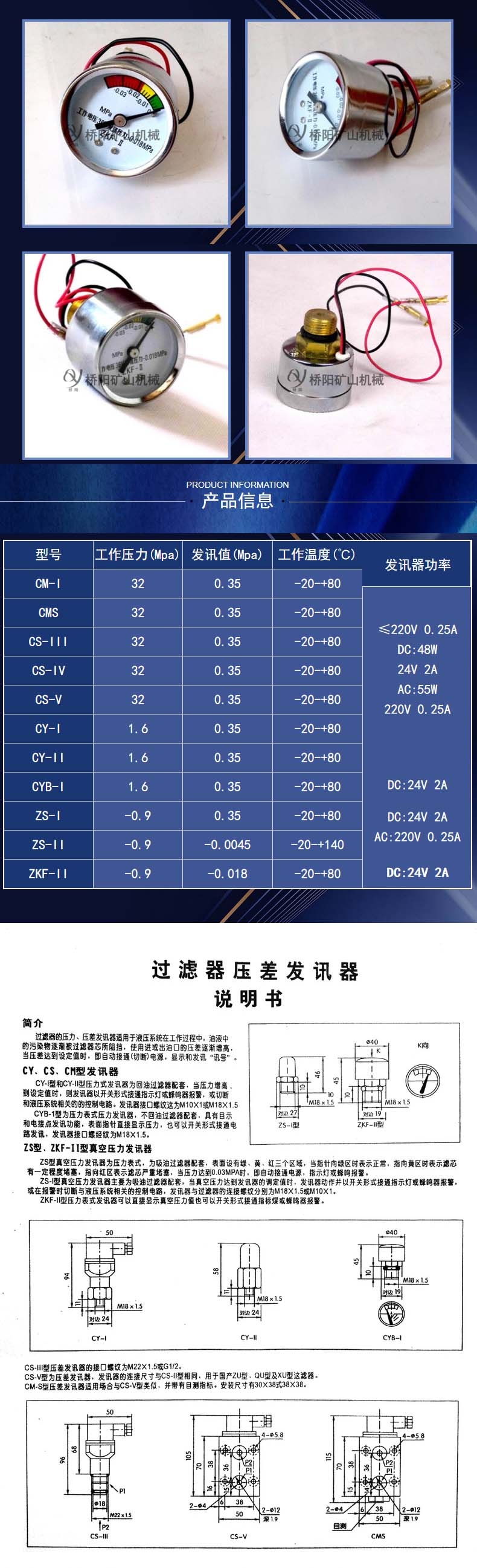 洛阳桥阳矿山机械有限公司生产的压差发讯器型号齐全,主要有CMS,CS-V,CM-I,CS-IV,CZ-II,CS-III,CYB-I,ZKF-II,CY-II,YM-I,ZS-I,CM-I-F等。ZKF-II型压力表式发讯器可以直接显示真空值,当真空值达到0.018MPa时,也可以开关形式接通指示灯或蜂鸣器报jing。注:ZKF-II不能与计算机配套使用。